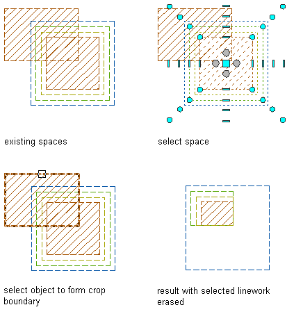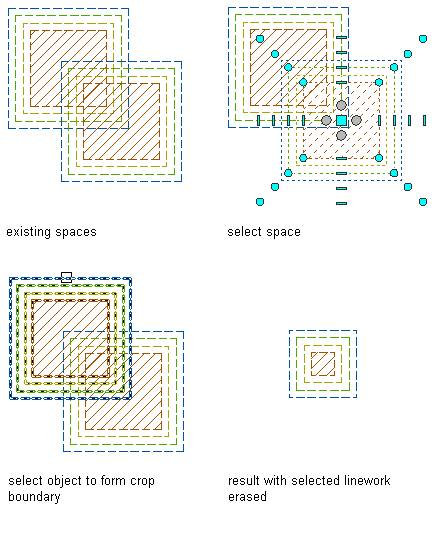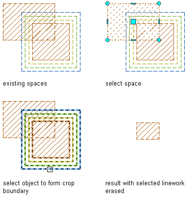 If a manual space boundary on the first space is not activated (displaying its grips), it is not included in the intersecting operation. This will effect the existing boundary on the first space to remain as it is, and the corresponding boundary on the second space to be deleted. This can result in irregular space boundaries. To avoid this, make sure that all relevant boundaries on the first space are activated.