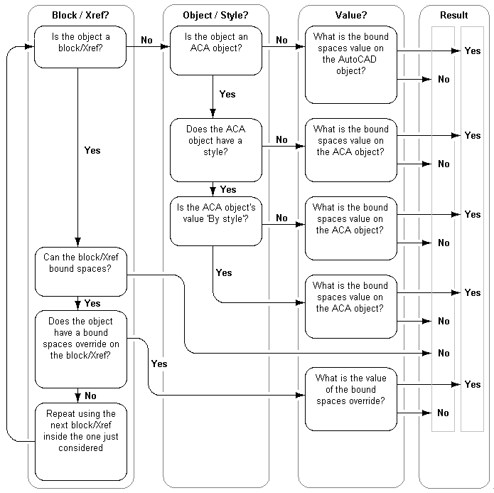 The following overview graphic shows how the setting of the Bound Spaces property on the boundary object affects the generation of associative spaces. For detailed information on how to set the Bound Spaces property for a boundary object, consult the sections following below.