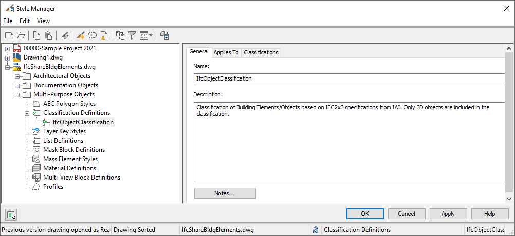 Exporting this drawing in IFC file format also exports the classification definitions. The classification definition is attached to the object type when you import the drawing.