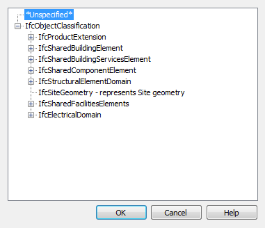 Note: IfcSiteGeometry is a unique classification. This classification can be applied to any object, but the object must be in an IfcSite drawing for the classification to be retained when exported. If it is not an IfcSite drawing (the IFC structure for drawings with xrefs attached), the IfcSiteGeometry classification is not preserved when exported to IFC.