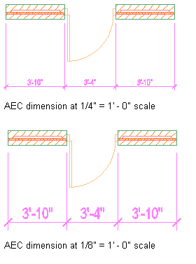 The following illustration shows an AEC dimension displayed at two different annotation scales. The AEC dimension was created in the drawing at the first annotation scale, then the annotation scale was changed.