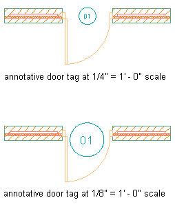 The following illustration shows a door tag displayed at two different annotation scales. The door tag was created in the drawing at the first annotation scale, then the annotation scale was changed.