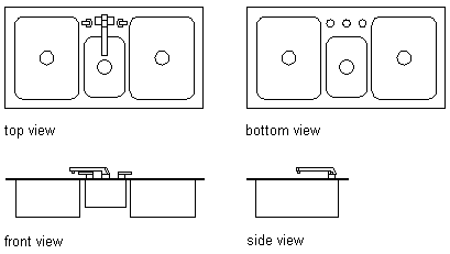 Multi-view blocks can be displayed differently in each view direction and each display representation. For example, the top view of a multi-view block representing a kitchen sink shows the top of the sink; the bottom view shows the bottom of the sink; and there are representations for left, right, front, and back views. Additionally, you can define a different group of displays for each display representation, so that you can have one set of views for Plan view and another for Reflected view.