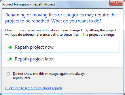 | update all project files later | click Repath project later. If you close the project before repathing, the drawing files remain in a queue for update and will display in the Project Repath Queue dialog box the next time you open it.