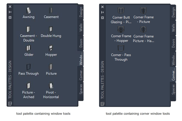| Custom tool palettes created by your CAD manager | window tools with window styles and properties that are customized for your projects or office standards |