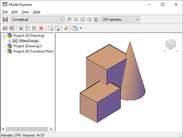 The Model Explorer is a window in which you create, view, and manipulate mass elements and mass groups. The Model Explorer uses the Object Viewer to let you preview the mass element and mass group operations you perform.
