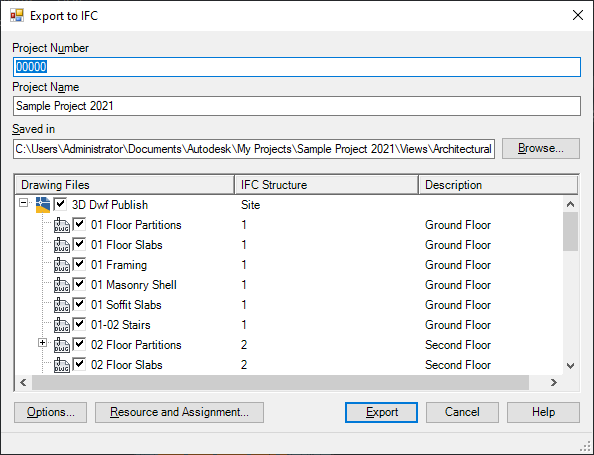 You control which xrefs in the project file are exported and how they display in the IFC file by either accepting the default level assignments or by specifying a different label. All drawings that are assigned to the same IFC Structure are exported into an IfcBuildingStorey in the IFC file.