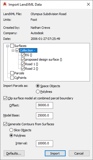 - In the Import LandXML Data dialog box, select the import options.