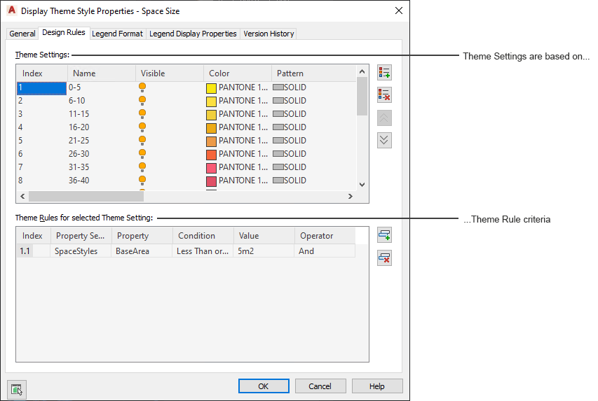 A display theme style defines a particular display theme for incorporating non-graphic data in a drawing by highlighting objects that meet criteria you specify. The type of highlighting is controlled through one or more theme settings, each of which specifies a particular color fill, hatch, or linetype. For each theme setting, there are one or more theme rules that determine which objects will be highlighted using that setting.