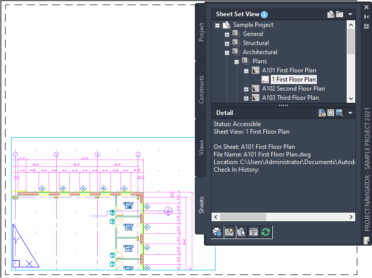 A sheet view is a paper space viewport on the sheet that is created when you drag a view drawing or model space view from the Project Navigator palette onto a sheet.