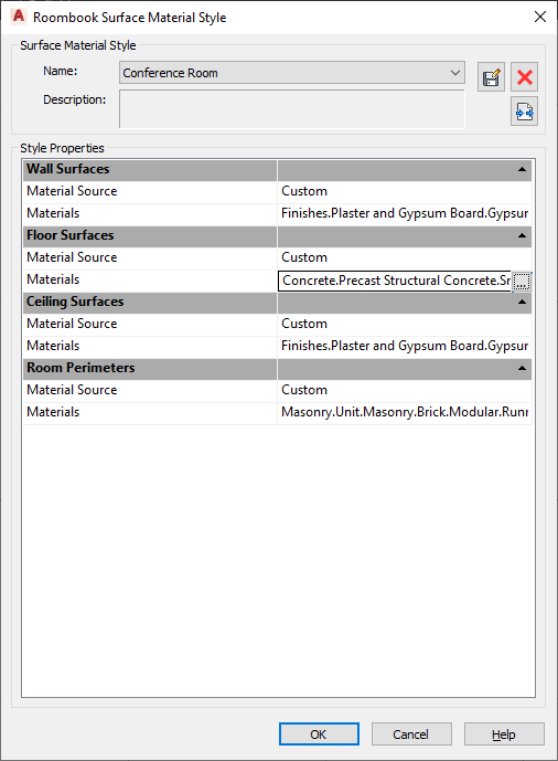 2. In the Roombook Surface Material Style dialog box, create or edit existing surface material styles or load surface material styles from the catalog.