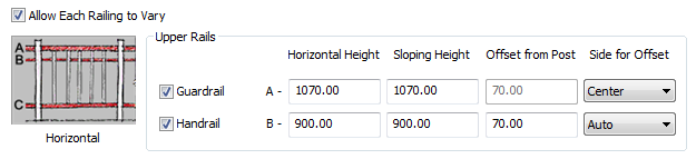 | specify guardrail and handrail properties, such as horizontal height, sloping height, and offset distance, when you add or modify railings | select Allow Each Railing to Vary. |