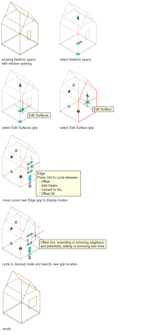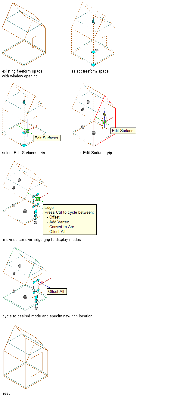 3D freeform space surface openings can be edited like any profile-based boundary in AutoCAD Architecture 2027 toolset. The opening boundary has vertex and edge grips to generate the desired shape.