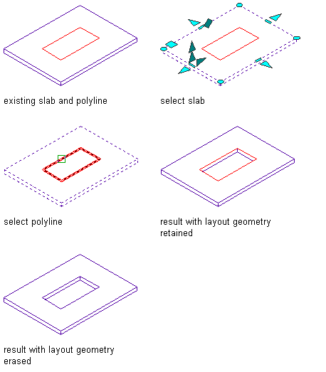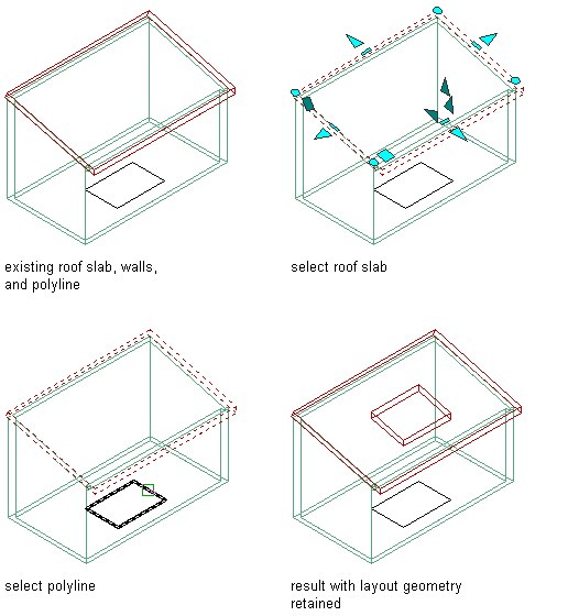 If the objects contain an interior void, you are prompted to use the inside or outside surface to create the hole. For example, if you create a chimney using four wall objects, you can cut the hole at the inside or outside of the chimney. The new hole faces are aligned with the surfaces of the cutting bodies, and are not necessarily parallel to each other.