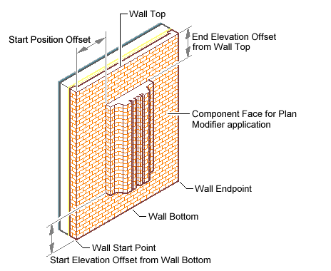 | specifying the ending height of the wall modifier | enter a value for End Elevation Offset, and specify whether the offset occurs from the wall top, the wall base height, the wall justification line, or the wall bottom. |