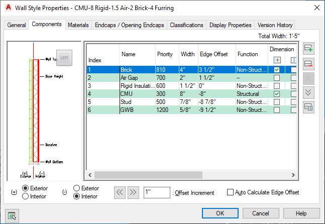 - Walls are directional and should be considered as having an exterior and interior side. The exterior, or positive side of the wall, is at the top of a wall running left to right. Wall components should be defined so that the index order is from exterior to interior. The component furthest to the exterior side of the wall should have an index assignment of 1, while the most interior component will have the highest index assignment.