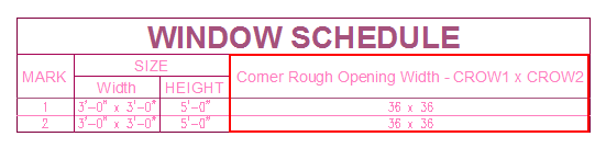 Notice, in the generated schedule, automatic property Corner Rough Opening Width – CROW1 x CROW2 is displayed.
