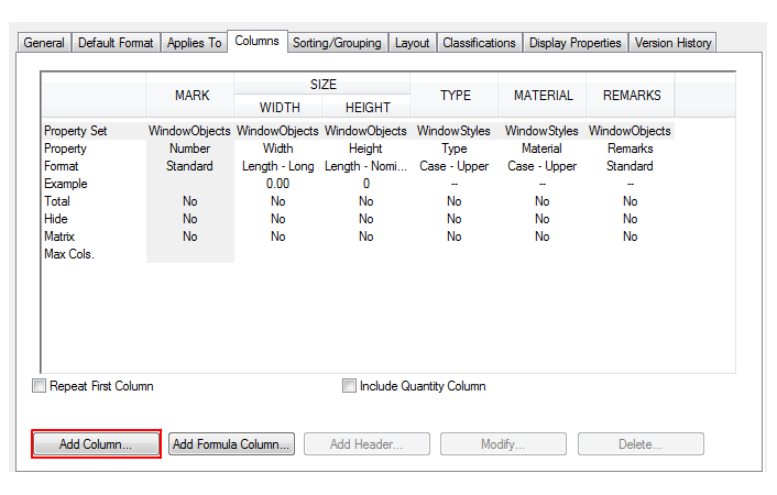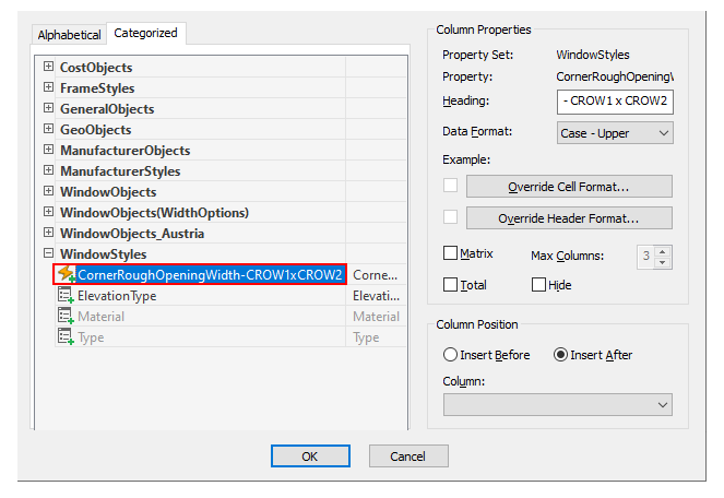 In the Add Column dialog box, under Window Styles select Corner Rough Opening Width – CROW1 x CROW2.