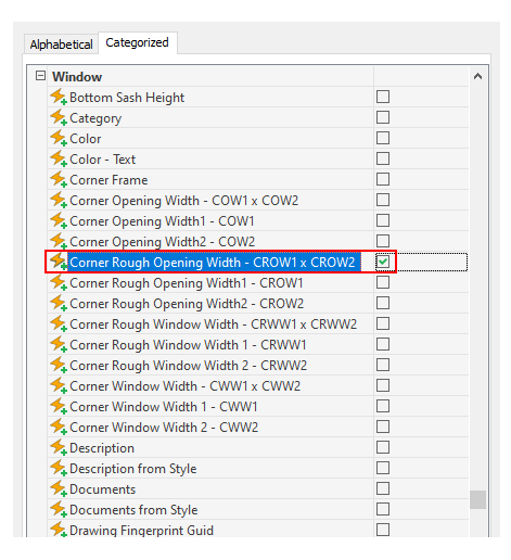 Under Window Styles select Corner Rough Opening Width – CROW1 x CROW2.