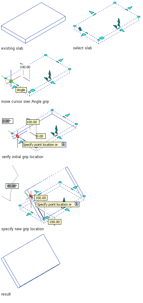 | adjust the slope by changing the rise of the slab | press Tab until the rise value is highlighted, and then either enter a value, or move the grip until the desired rise is displayed, and then click. |