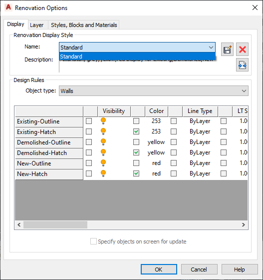 Modify Renovation design rules to rename or reassign layers for objects based on their object type and Renovation category. These changes are saved in the current drawing.
