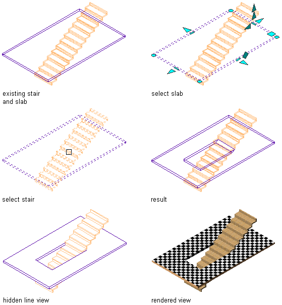 Use this procedure to create a stair interference area in a slab. When you add an interference condition between a stair and a slab, a box is cut out around the stair based on the specified headroom height and left and right side clearances for straight and multi-landing stairs or inside and outside clearances for spiral and U-shaped stairs.