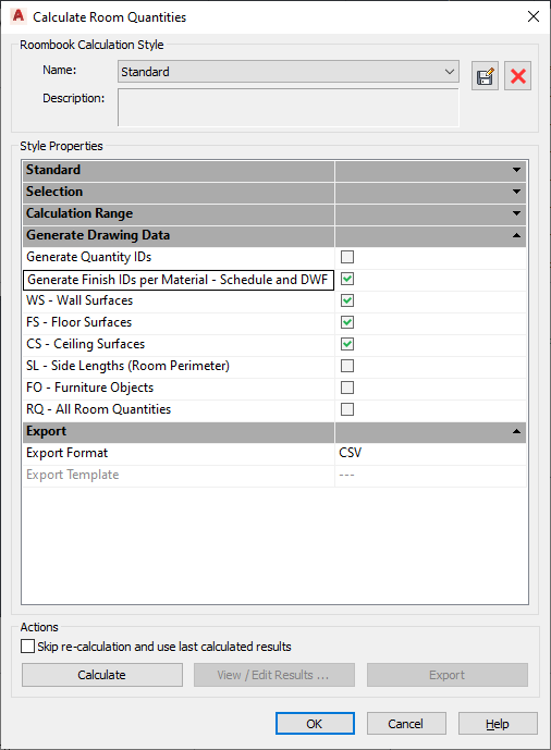2. In the Calculate Room Quantities dialog box, under Style Properties, Generate Drawing Data list, select Generate Finish IDs per Material.