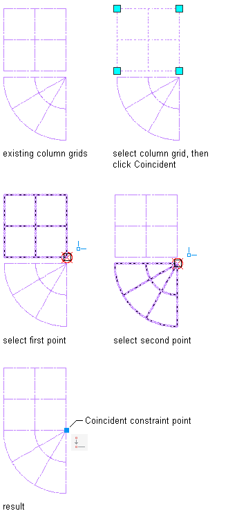 When you move one of the column grids, the other one moves with it. You can also rotate one of the column grids about the Coincident constraint point. To fully constrain both grids, add another Coincident constraint to the other column grid corner.