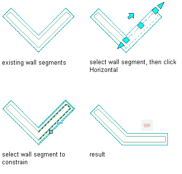 The Horizontal constraint constrains lines or pairs of points on AEC objects to lie parallel to the X-axis of the current UCS. When you specify 2 points to horizontally constrain, the second point is made horizontal to the first point.