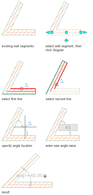 The Angular constraint maintains a specific angle between 2 AEC objects. The Angular constraint also works between appropriate AEC objects and AutoCAD objects, such as a wall segment and a line.