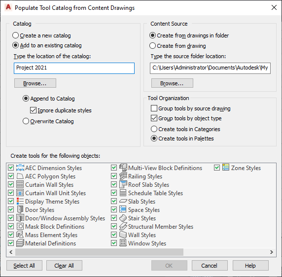 | organize the resulting tools by their source drawing | select Group tools by source drawing. This option is well suited for a tool catalog that is generated from a number of styles drawings. The resulting tools could be placed in categories or palettes named “Wall Styles - Concrete (Imperial),” “Wall Styles - CMU (Imperial),” and so on. |