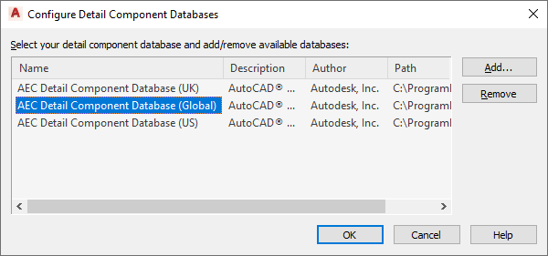 - On the AEC Content page, click the Add/Remove button for Detail Component Databases.