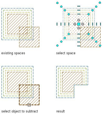 When you subtract one space from another, the base boundary of the subtracted space is subtracted from all boundaries of the first space. The other boundaries of the subtracted space are just deleted without interacting with the first space. Depending on whether the first space has style-defined offsets or manual offsets, the boundaries around the hole are either re-calculated according to the style offsets or cut off at the intersection.
