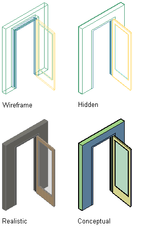 Doors in Wireframe, Hidden, Realistic, and Conceptual Visual Style representations