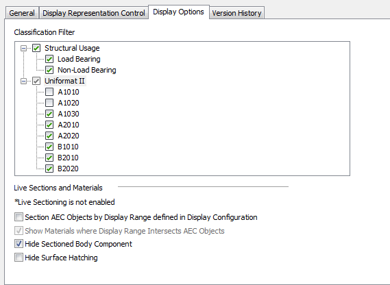 For example, to hide all doors and walls classified as A1010 and A1020, clear the check boxes for A1010 and A1020 under Uniformat II.