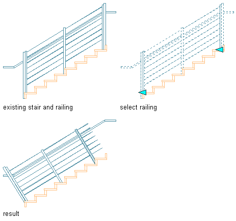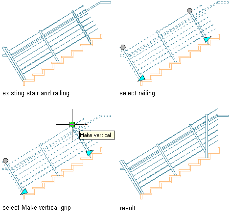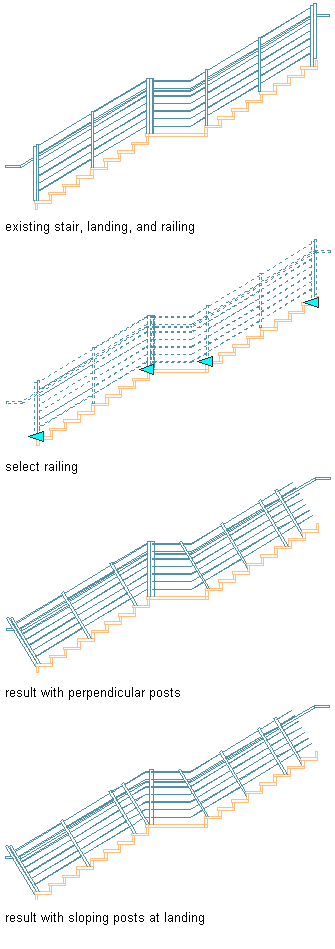 Once a perpendicular railing orientation has been specified, you can use grips to change first and last posts to a vertical orientation.