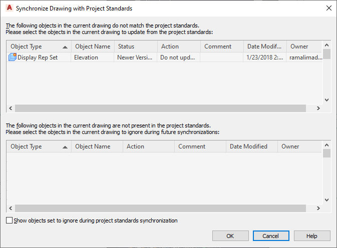 In this case, the not standardized object will not be listed again in future synchronizations, except if you select Show objects set to ignore during project standards synchronization, or remove the Ignore flag from the style or display setting in Style Manager or Display Manager, as described in To Exclude Styles and Display Settings From Synchronization.