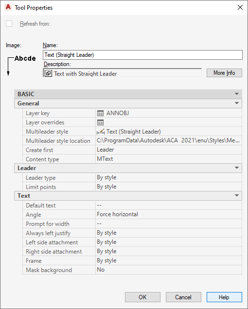 | Leaders/Leader dimension style location | Specifies the location of the dimension style if different from the current drawing dimension style. Click the property and use the Browse option from the drop-down list to locate and enter the path to the selected style. If this property is unspecified (--), then only those styles in the current drawing are used. |