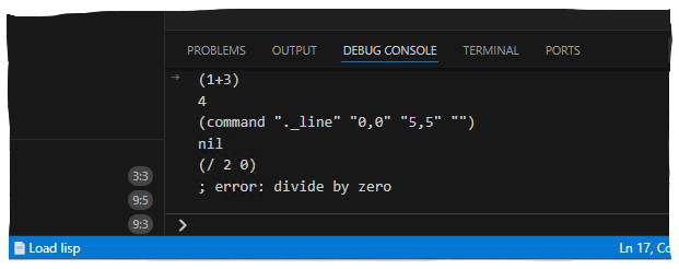 When an instance of the AutoCAD application is attached to VS Code, you can enter and execute AutoLISP expressions in the Debug Console.