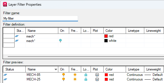 In this example, the layer property filter includes layers that start with "mech" and are red or layers that start with "mech", are off, and white.