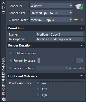 Render By Level. Specifies the number of levels, or iterations, the render engine performs to create the rendered image. (RENDERLEVEL system variable)