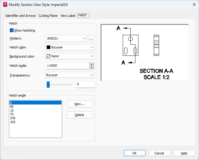 Controls the properties for appearance and behavior of hatch objects within model documentation section views.