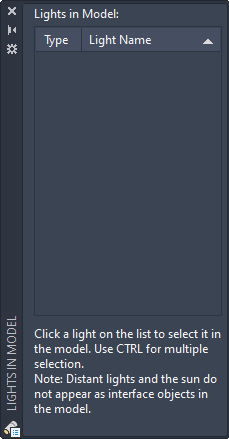 An icon in the Type column indicates the type of light: point light, spotlight, or distant light, and whether it is on or off. Select a light in the list to select it in the drawing. To sort the list, click the Type or Name column head.