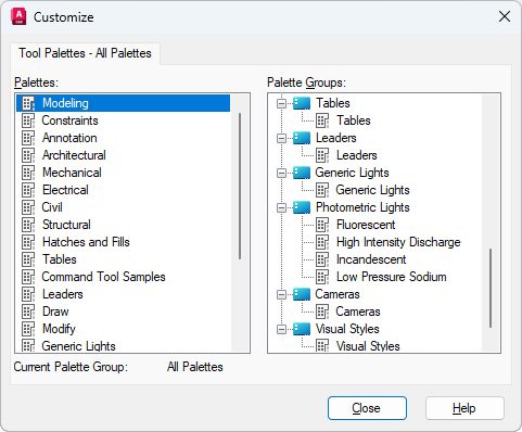 In the Customize dialog box, right-click to display shortcut menus and manage tool palettes and palette groups. Click and drag items to add and reorder tool palettes in palette groups.