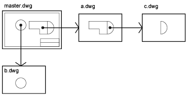 In the following illustration, master.dwg references a.dwg and b.dwg. Drawing a.dwg references c.dwg. In master.dwg, c.dwg is a nested xref.