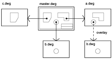 In the following illustration, several people are working on drawings referenced by master.dwg. The person working on a.dwg needs to see the work being completed by the person working on b.dwg, but does not want to xref b.dwg because it would then appear twice in master.dwg. Instead, the person overlays b.dwg, which is not included when a.dwg is referenced by master.dwg.