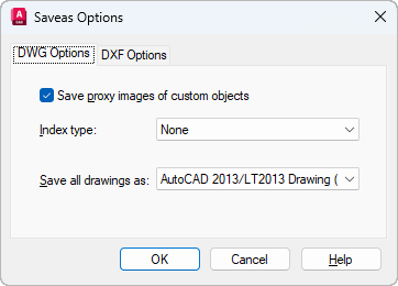 If you save to an earlier format, or the drawing contains custom objects from another application, select Save Proxy Images of Custom Objects to save images of the custom objects in the drawing file. (PROXYGRAPHICS system variable)
