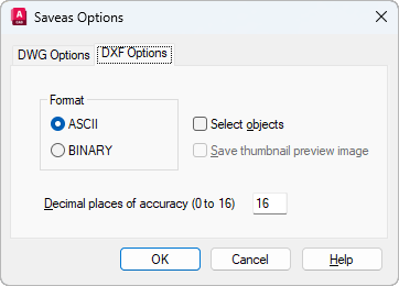Specifies whether to create an ASCII or a binary DXF file. ASCII-format DXF files can be read with a text editor and are compatible with a wider range of applications. Binary-format DXF files are more compact. Read and write operations with binary-format files is faster than with ASCII-format files.