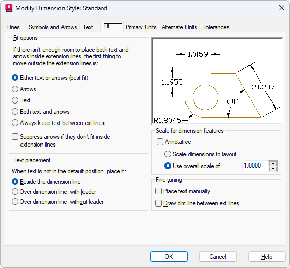 Controls the placement of text and arrowheads based on the space available between the extension lines.