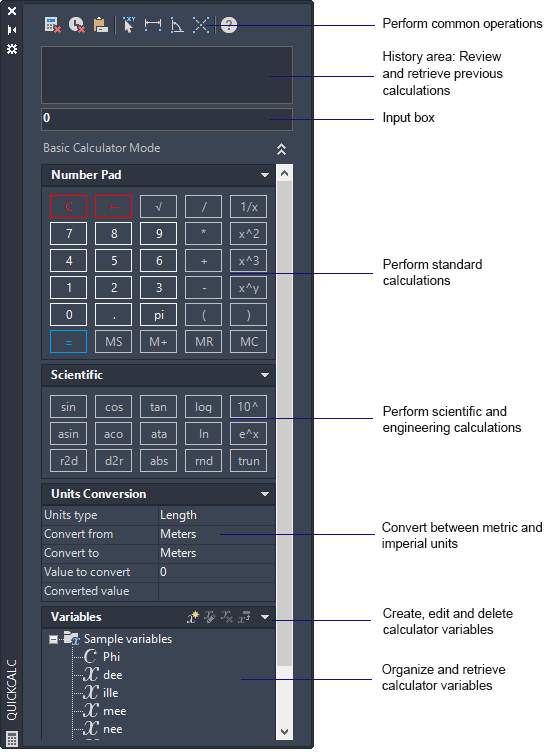 The QuickCalc calculator includes geometric functions, unit conversions, and variables, in addition to the basic features found in scientific calculators.